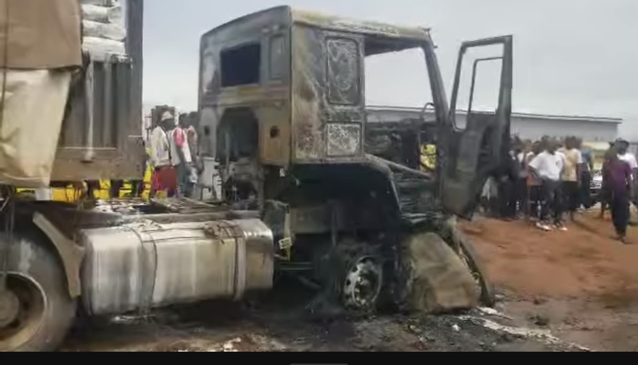 A tragic road accident occurred today at Four Corner, Enugu, where a Dangote truck reportedly collided with a car carrying an entire family of four. Eyewitnesses revealed that the impact was so severe that the vehicle caught fire, leading to the death of all its occupants.